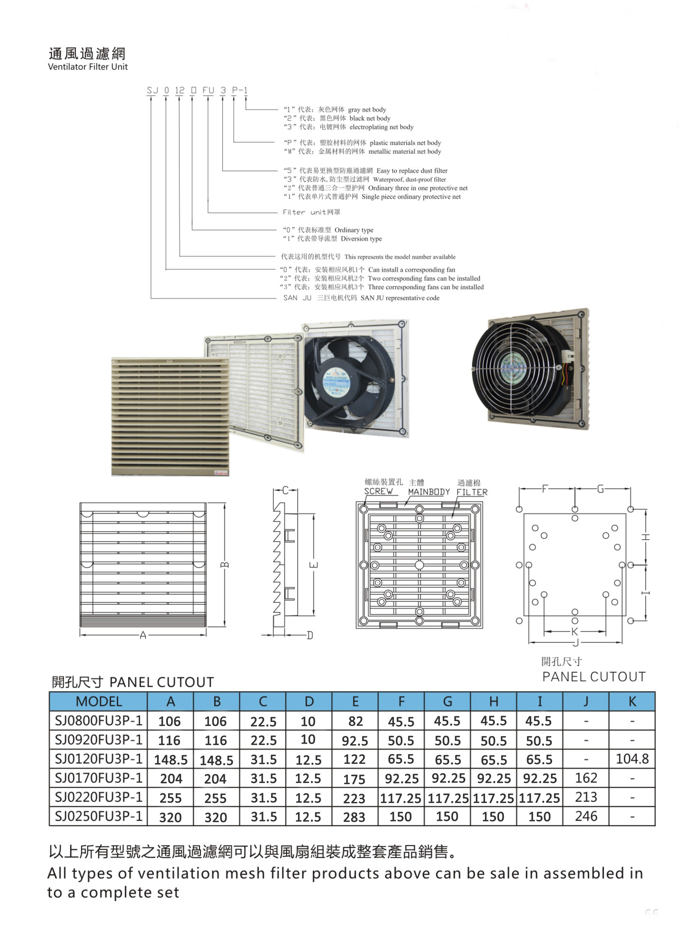 所有型號通風過濾網可以與風扇組裝成整套產品銷售